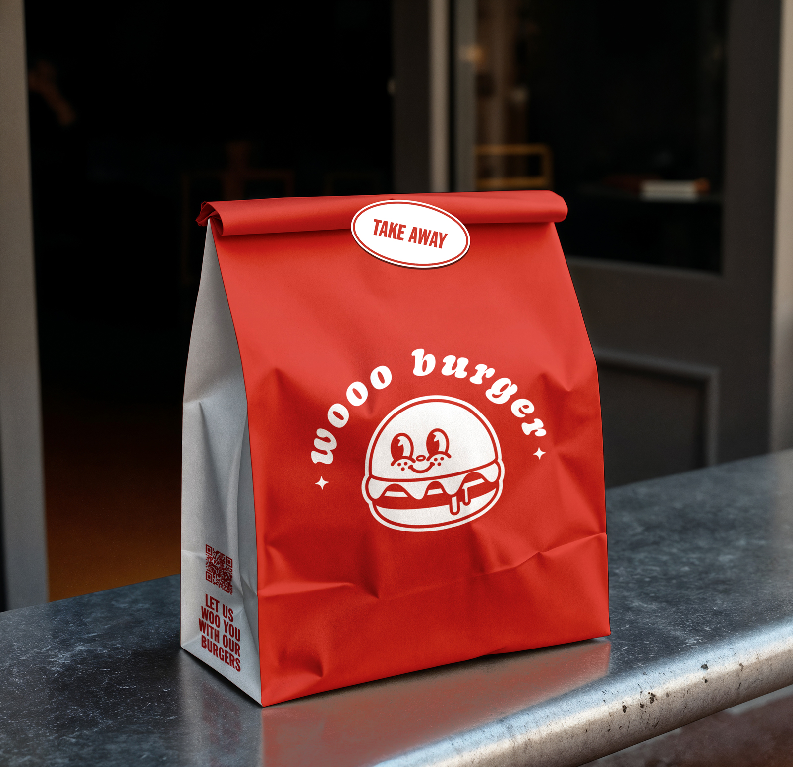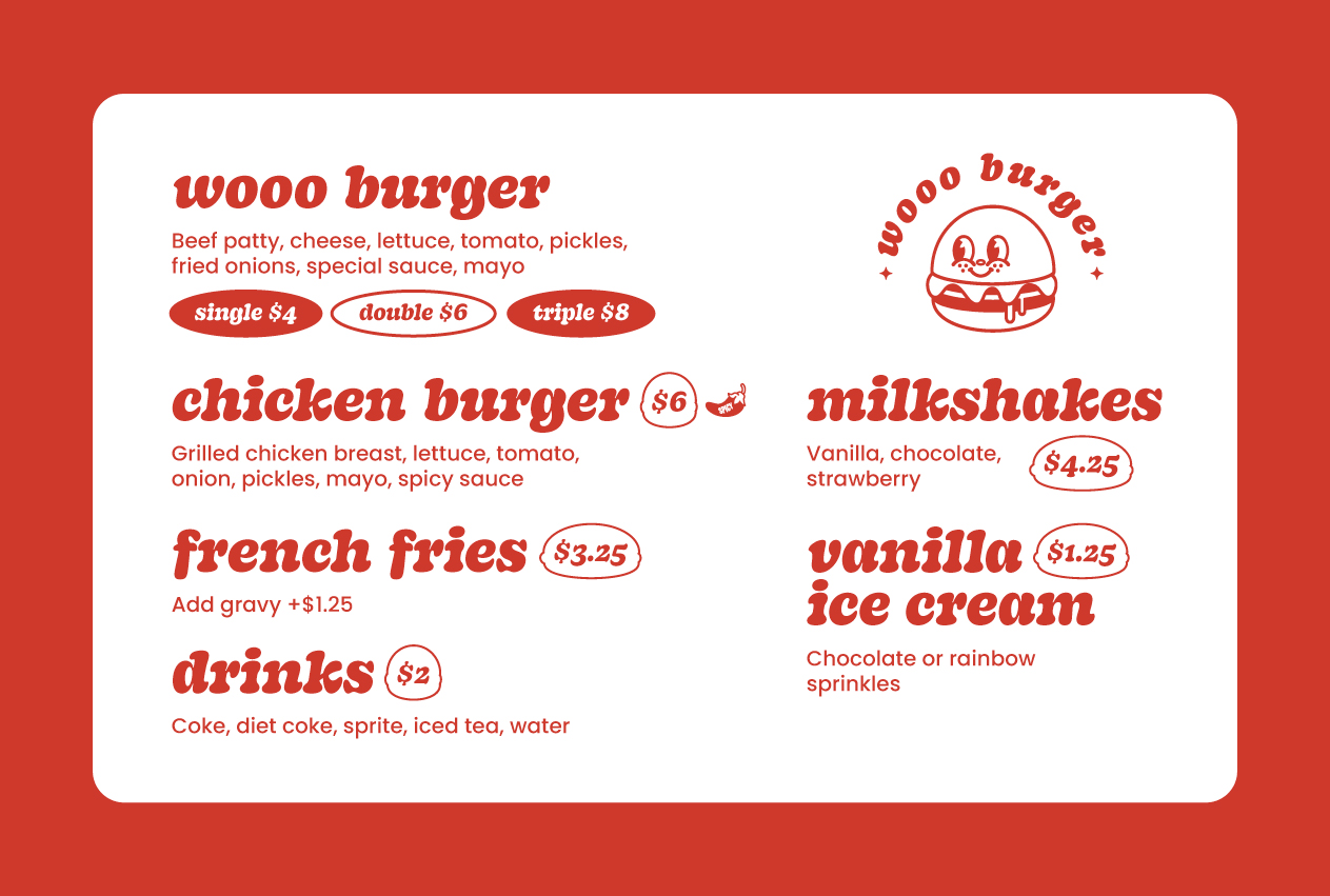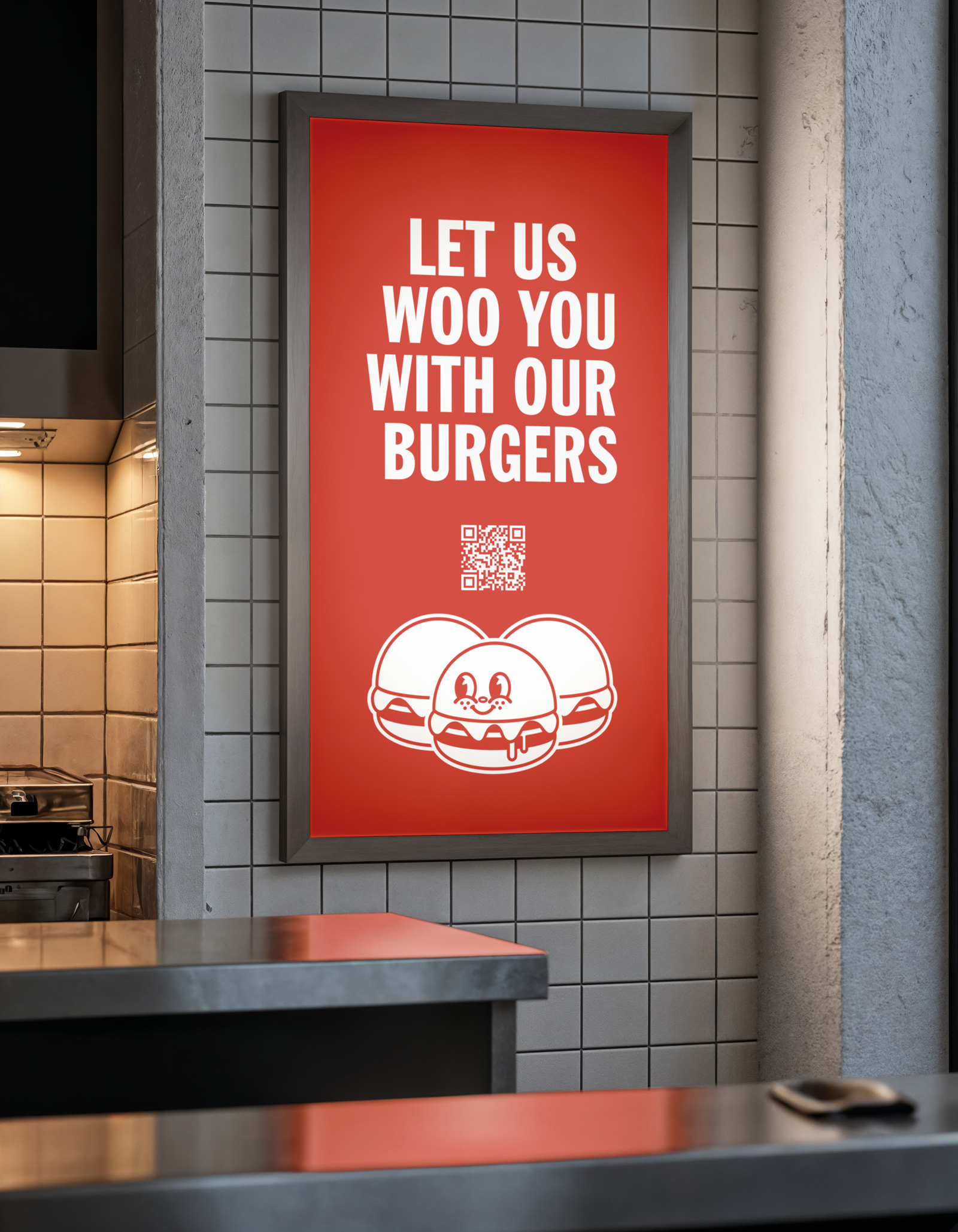 Wooo Burger—a fictional fast food restaurant located in Toronto, renowned for its delicious burgers, sides, drinks, and desserts. 'Wooo Burger' emphasizes burger joy, guided by the creative direction 'Let us woo you with our burgers.'